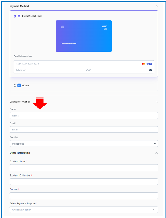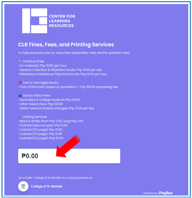 5. Fill-out the required details (Amount, Student/Associate ID, Student/Associate Name & Email Address). On the Payment Purpose, select "Library-Overdue, Processing Fee, Book Quotation". Kindly note that you will be charged a service fee of PHP 25.00, this is on top of the bill you are supposed to pay to the library.